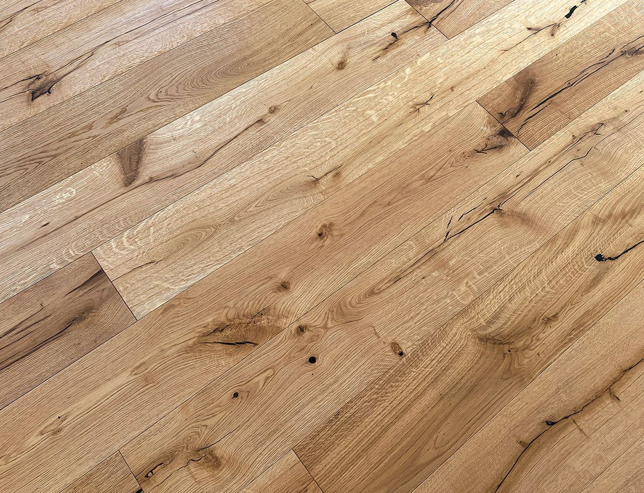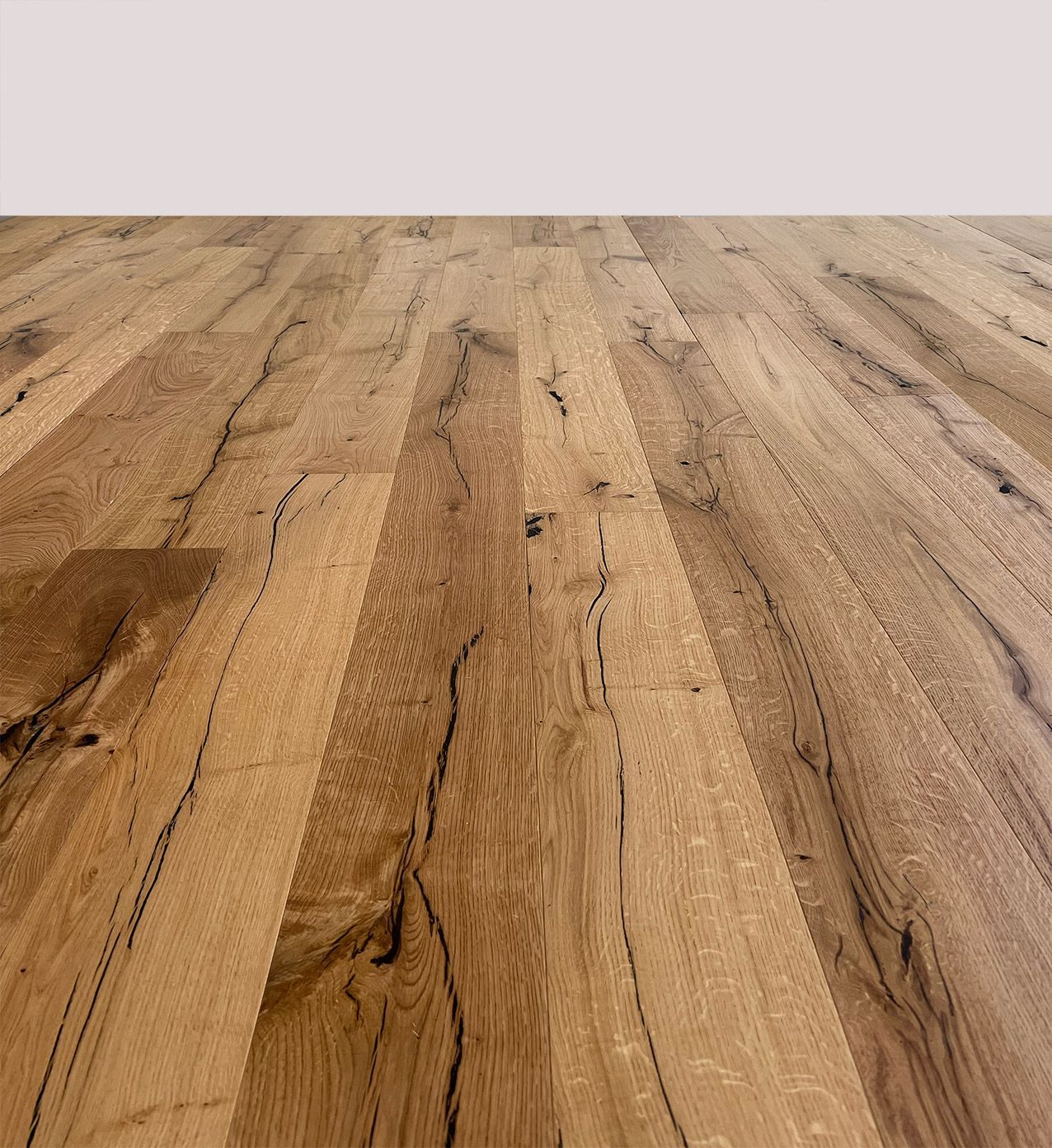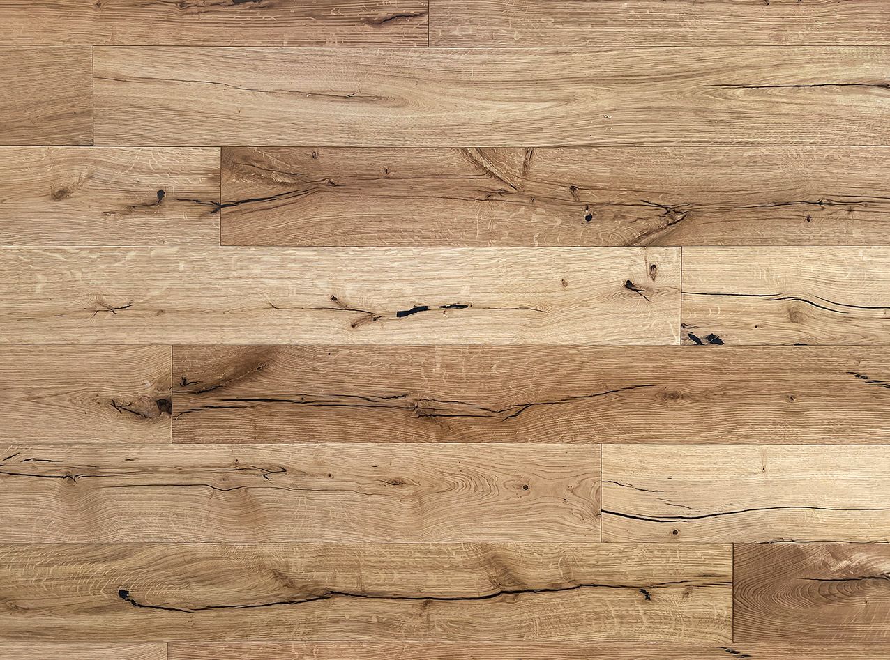 Parquet Doghe in Rovere spazzolato, oliato, naturale. Proposto nella scelta DE, che prevede difformità di colore, nodi stuccati, crepe di grandi dimensioni riparate e alburno.