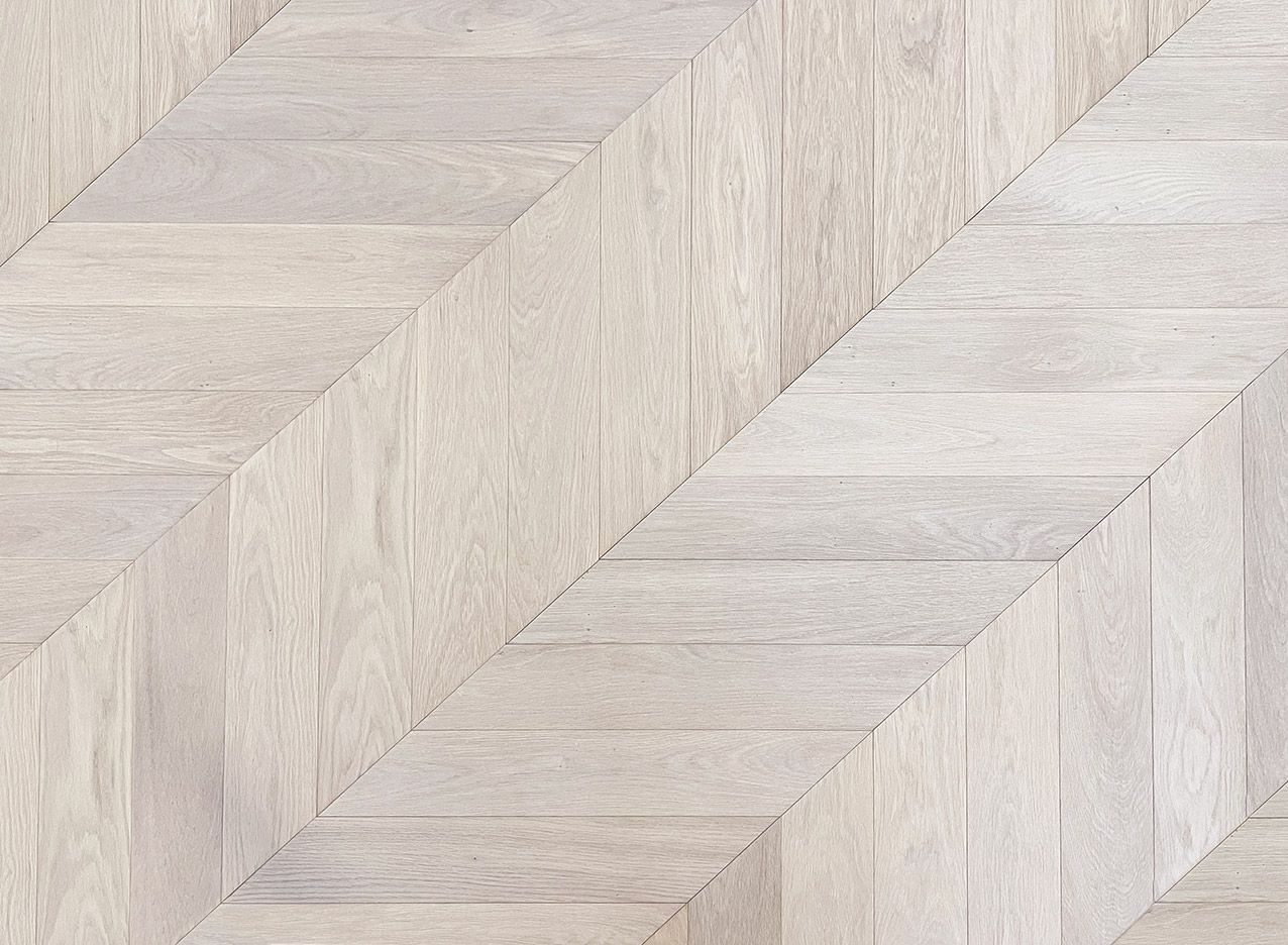 Parquet Spina Ungherese in Rovere spazzolato, verniciato, Bianco Polare. Proposto nella scelta AB, caratterizzata da venatura rigata e fiammata, uniforme di colore, ammessi saltuari e piccoli nodi.