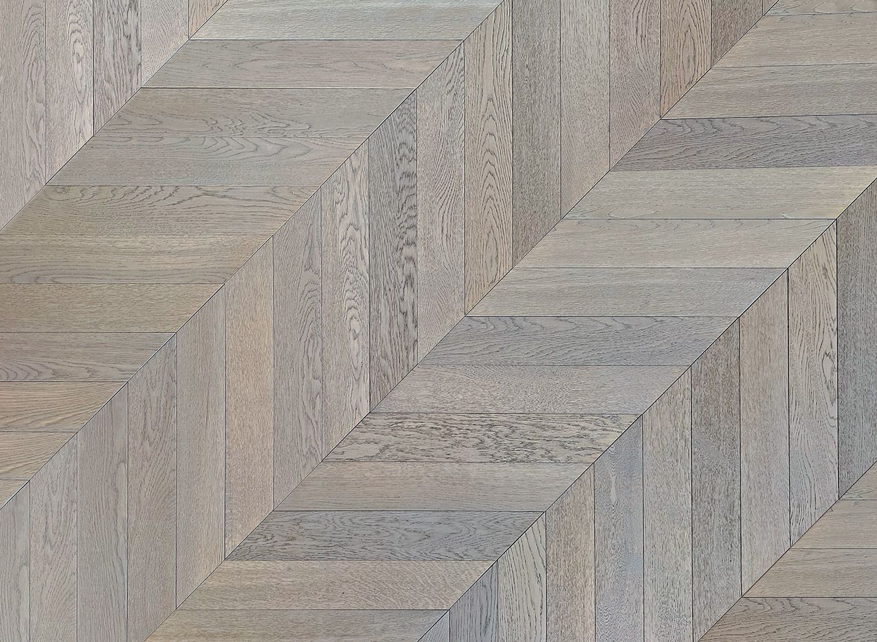 Parquet Spina Ungherese in Rovere spazzolato, verniciato, Grigio Pietra. Proposto nella scelta AB, caratterizzata da venatura rigata e fiammata, uniforme di colore, ammessi saltuari e piccoli nodi.