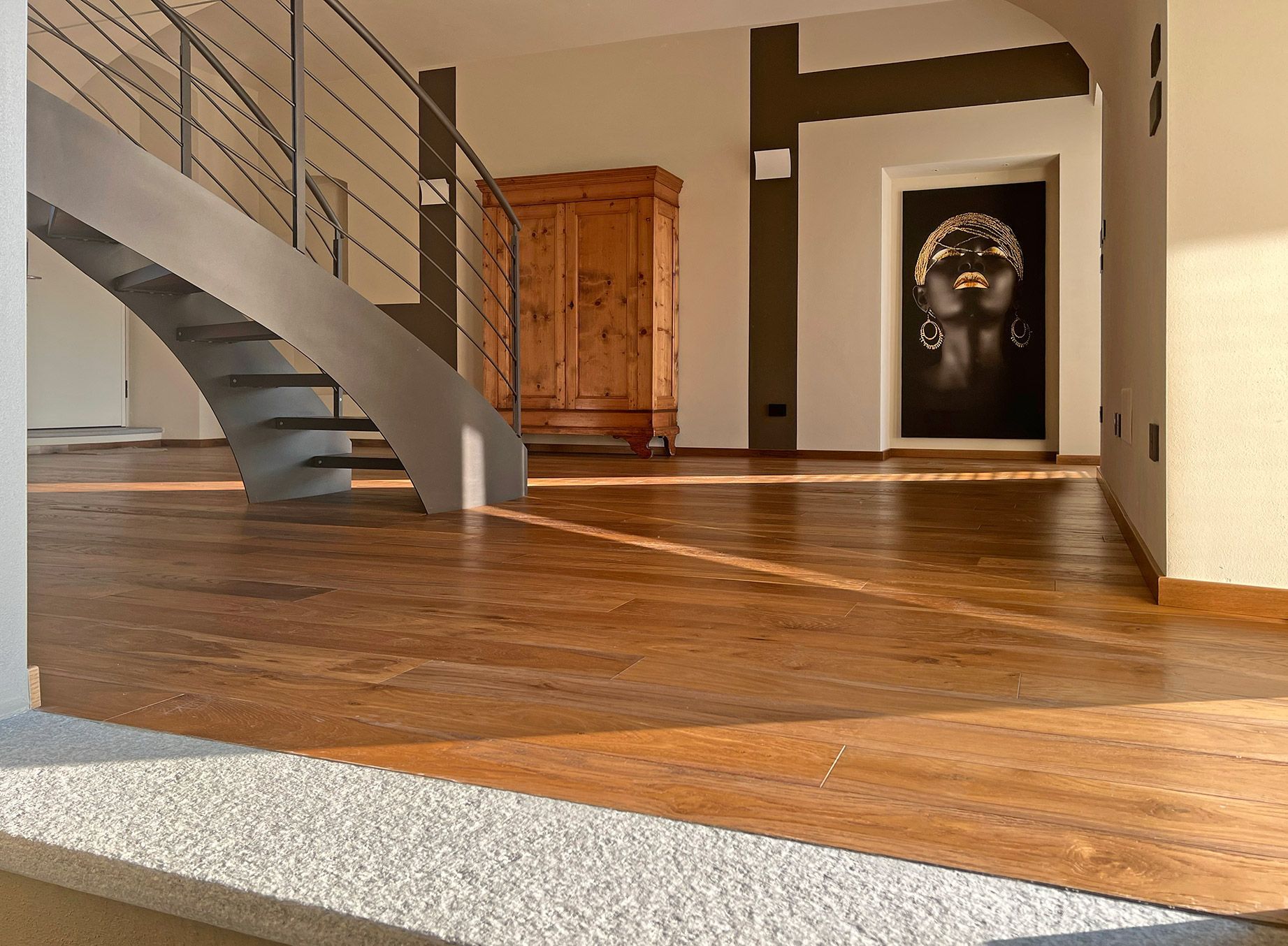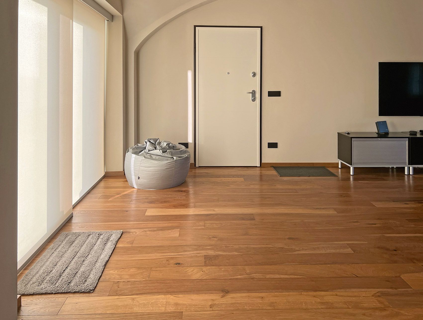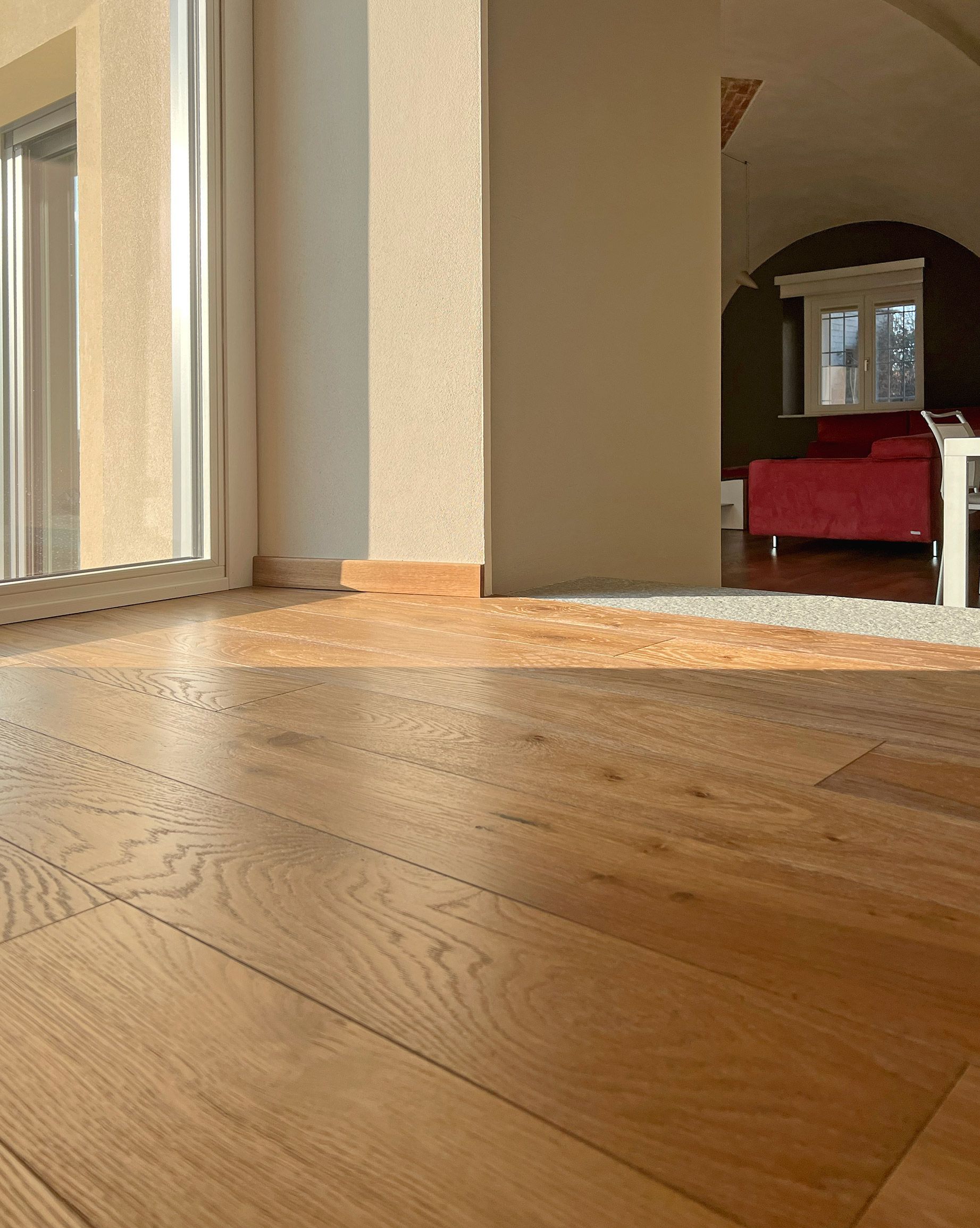 Parquet Doghe in Rovere spazzolato, verniciato, affumicato. Proposto nella scelta UNICA, che può racchiudere tutte le caratteristiche del legno, compresi difformità di colore, nodi grandi ed alburno.
