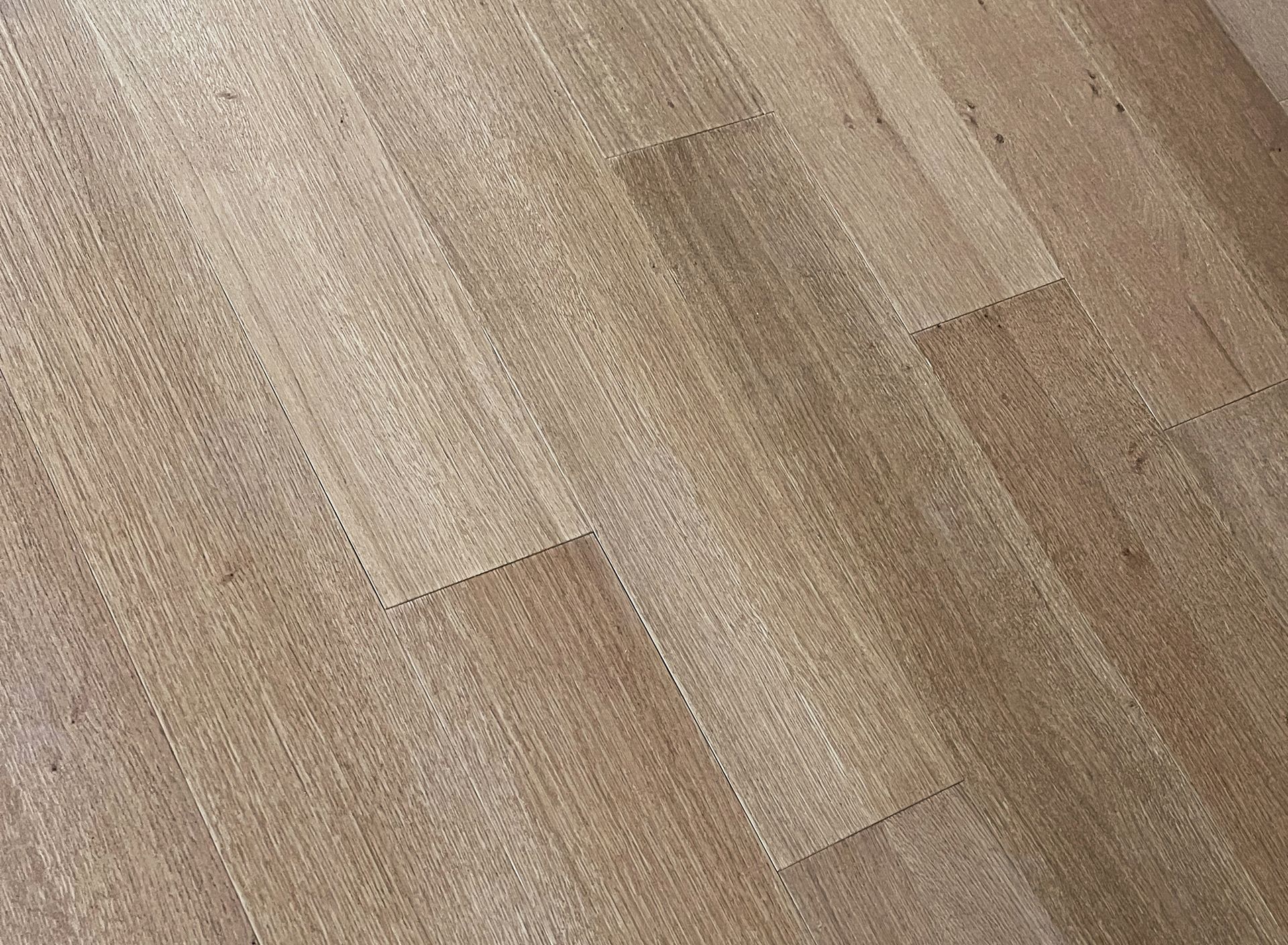 Pavimento con strato nobile di vero legno Rovere proposto nel trattamento Miele con scelta AB. Si tratta di un pavimento in legno duro con qualsiasi disegno di venatura (semplice, semivenato o venato), dal colore del legno naturale, variegato, con piccoli accenti di nodi e alburno presente sporadicamente.